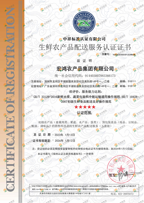 “生鲜农产品配送服务五星级认证证书”